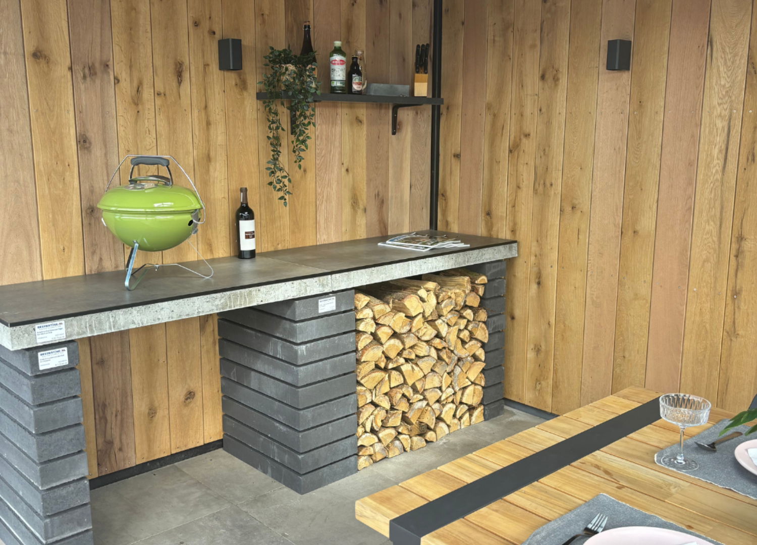 Je tuinhuis inrichten als bar verandert je tuin in dé plek voor gezellige avonden met vrienden en familie. Dat begint met een stevige basis van grote keramische tuintegels die bestand zijn tegen gemorste drankjes en intensief gebruik. Kies voor donkere tinten die vlekken minder snel laten zien. Voor de bar zelf heb je verschillende mogelijkheden: bouw er zelf een met Trendhout voor een warme uitstraling of creëer een professionele buitenbar met Globe muurelementen.