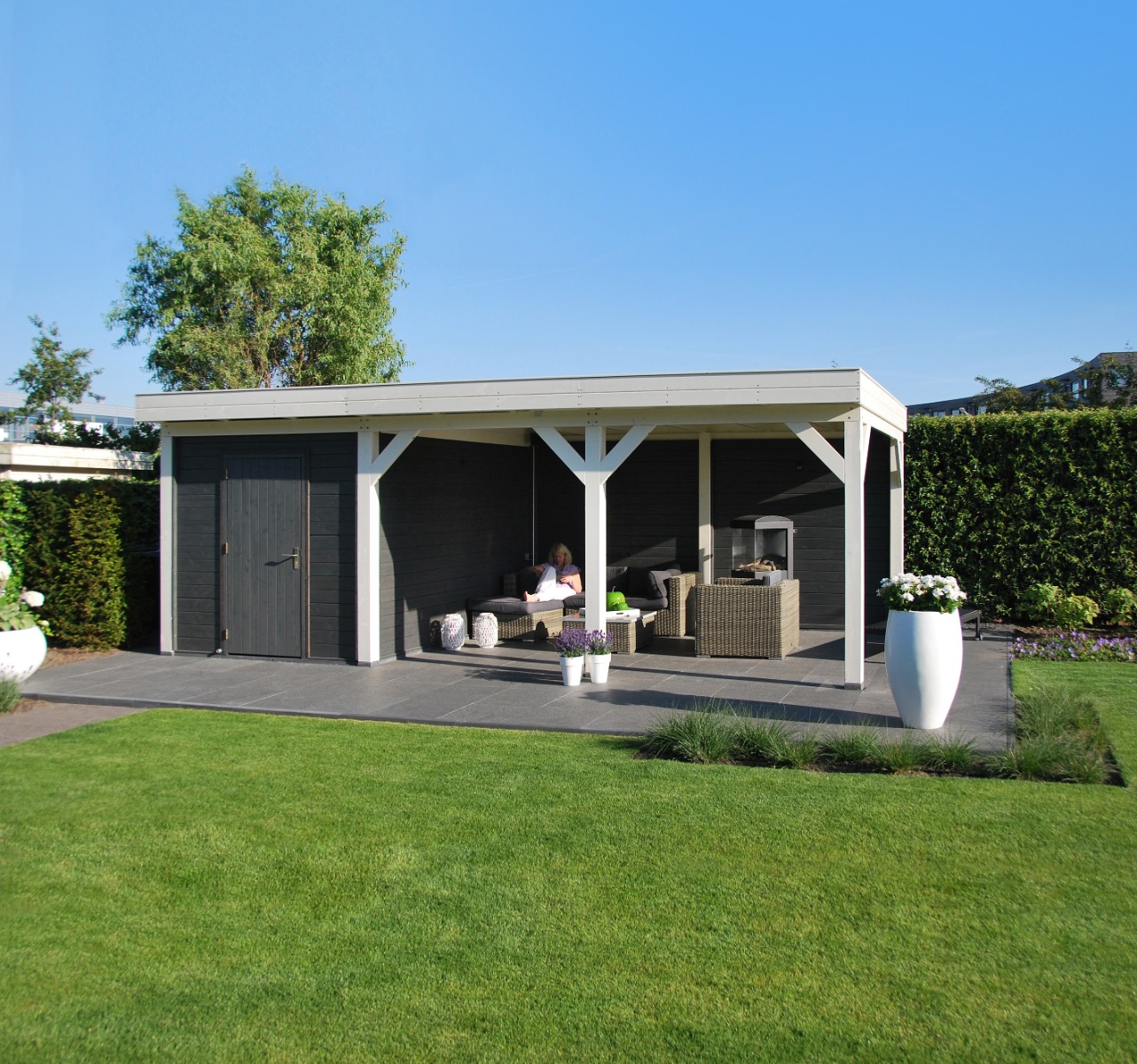 Trendhout Mensa is een modern buitenverblijf met plat dak dat stoer en sfeervol oogt. De strakke vormgeving met subtiel dakoverstek past perfect in eigentijdse tuinen. Dankzij de robuuste staanders en hogere gordingen zijn grotere overspanningen mogelijk, wat zorgt voor een ruimtelijk effect. Uitgevoerd in duurzaam Douglas hout, met een diepte van ca. 4 meter en breedtes van 4 tot 10 meter. Leverbaar als compleet bouwpakket met op maat gezaagde onderdelen voor eenvoudige montage.
