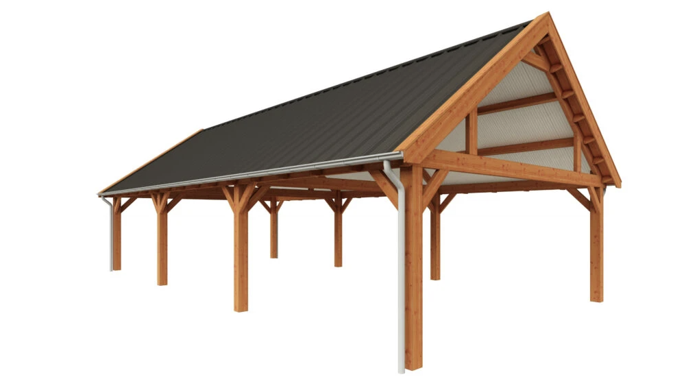 - Open zijdes voor carportfunctie gecombineerd met gesloten wanden voor bergruimte