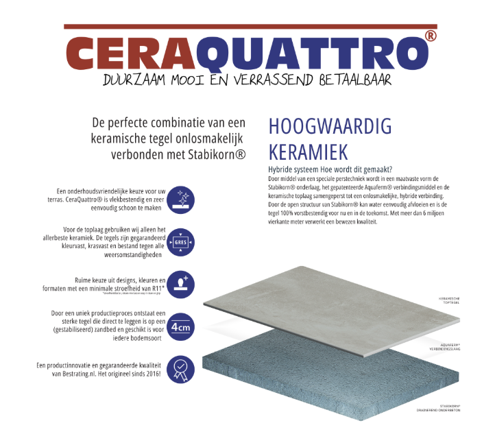 CeraQuattro® tegels zijn opgebouwd uit een keramische toplaag met een stabiele onderlaag. Hierdoor kun je ze direct op een goed voorbereid zandbed leggen en is een aparte fundering meestal niet nodig. Dat maakt het verwerken sneller en makkelijker, zonder in te leveren op kwaliteit.